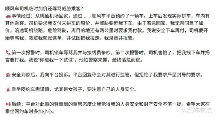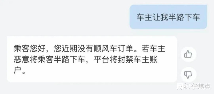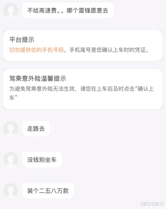 乘客更觉得冤,明明选的是 “独享”,上车发现副驾还坐了个人,司机说 “顺路带一个,不耽误你”;有的走一半突然说 “高速费得你出,不然我就下道绕路,耽误点时间而已”;最气的是半路被甩,比如高速口说 “不出高速费就下车,我不去了,你自己叫车吧”,尤其是凌晨或者偏远地方,根本叫不到车,只能站在路边干着急,回头投诉也没个准信。